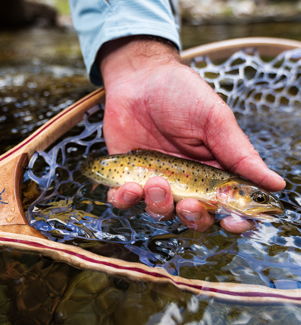 This beautifully crafted wood fishing net is perfect for small stream fly fishing. The handle is made from striking English Walnut, while the net's hoop is a graceful lamination of European Beech and Cherry. The clear rubber net bag is gentle on fish, and the hoop's size is ideal for landing trout up to 15 inches. This is my go-to net when I’m heading up to a high alpine lake or to a laurel-covered stream. I really like the contrast between the dark handle and lighter hoop.